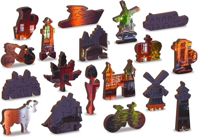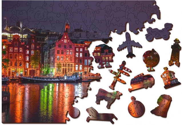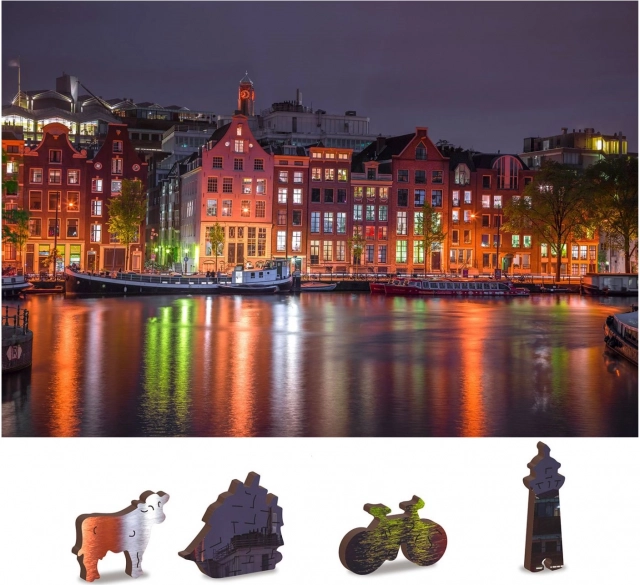 Ta edinstvena lesena sestavljanka bo razveselila vsakega ljubitelja sestavljanja. Zahvaljujoč laserskemu izrezovanju ponuja sestavljanka gladke robove, ki se enostavno povezujejo. Vsebuje skupno 150 kosov, od katerih ima 30 kosov edinstvene oblike kot so živali ali znane zgradbe, kar doda vzgojni element in vizualno estetiko. Sestavljanka je zasnovana kot 2v1, kar pomeni, da jo lahko sestavljate tako po izpopolnjenem nočnem motivu Amsterdama kot po obliki z vzorcem na zadnji strani.
