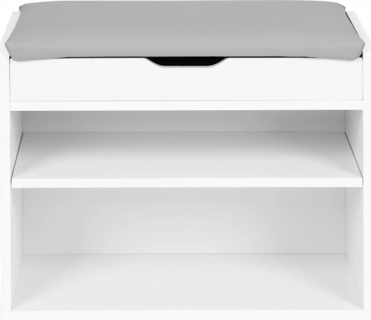 Praktična in moderna bela omarica za čevlje s pohodlno klopjo za enostavno obuvanje ter shranjevanje obutve in drobnih predmetov v vaši predsobi ali spalnici. Klop iz eko usnja zagotavlja udobje, medtem ko odpiralen prostor in dve prilagodljivi polici nudita dovolj prostora za shranjevanje različnih predmetov.