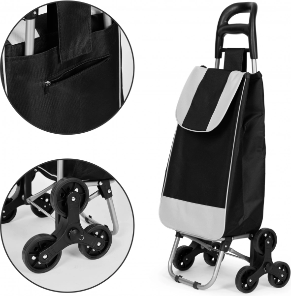 Voziček je opremljen s trojnimi gumijastimi kolesi za enostavno premagovanje ovir, kot so robniki ali stopnice, kar omogoča preprost prevoz vašega nakupa z minimalnim naporom.