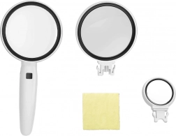 Ta večnamenska lupa združuje močno povečavo z udobno uporabo. Zahvaljujoč dvema vgrajenima LED-diodama nudi enakomerno osvetlitev opazovanega predmeta, zato je odlična za pregled kovancev, znamk, nakita in pri branju drobnega besedila. Zamenljive leče preprosto prilagodite določeni dejavnosti.