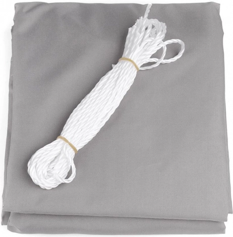 Ojačani vogali s kovinskimi D-obročki in priložene vrvice omogočajo hitro in varno napenjanje med stenami, stebri ali drevesi.