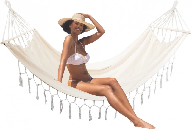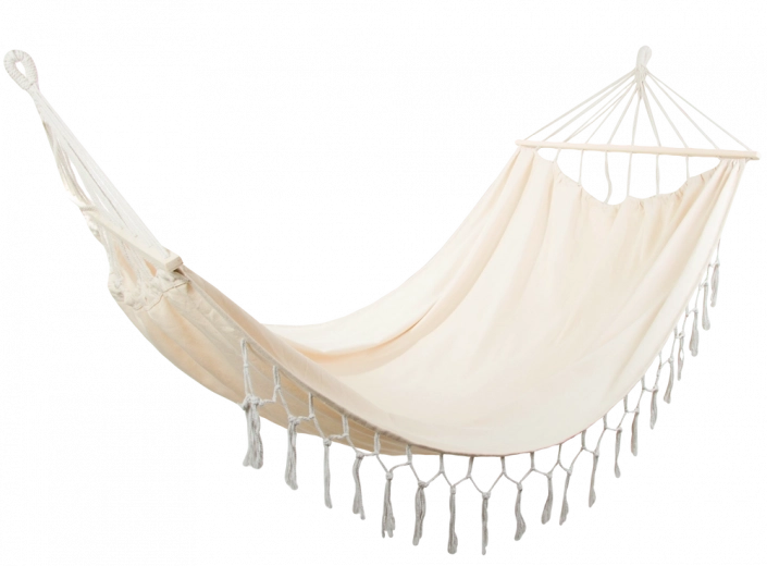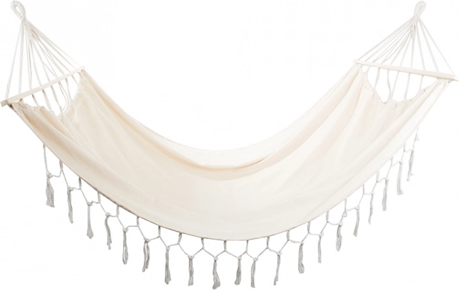 Ta boho viseča mreža je idealna za pare in posameznike, ki imajo radi udobje in stil. Široka ležalna površina z lesenimi razporniki ohranja tkanino lepo razpeto, zato se lahko udobno namestite in uživate v miru na vrtu, balkonu ali na dopustu.