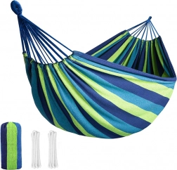 Dvojna viseča mreža je popoln dodatek za vsakogar, ki si želi uživati v trenutkih miru na svežem zraku. Izdelana je iz trpežnega bombaža z dodatkom poliestra, kar zagotavlja dolgo življenjsko dobo in udobno uporabo. Zahvaljujoč priloženim vrvem jo lahko enostavno pritrdite med drevje ali stebre in se takoj sprostite.