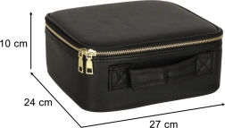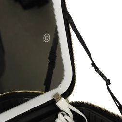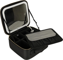 Elegantna črna kozmetična torbica ohranja vašo opremo popolno pregledno doma in na poti. V notranjosti boste našli nastavljive pregrade, žep za čopiče ali šminke ter odporno oblazinjenje, ki varuje vsebino. Vgrajeno LED ogledalo s tremi načini osvetlitve in na dotik občutljivim senzorjem zagotavlja natančno ličenje kjerkoli.