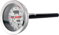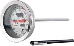Termometer vsebuje simbole za optimalne temperature različnih vrst mesa ter čitljivo številčnico.