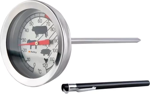Termometer je zasnovan tako, da ustreza potrebam domačih kuharjev in profesionalcev. S tankim vrhom sonde, ki zlahka prodre v meso, zmanjšuje poškodbe jedi. Idealen za preverjanje notranje temperature večjih kosov mesa, kot sta šunka ali slanina.
