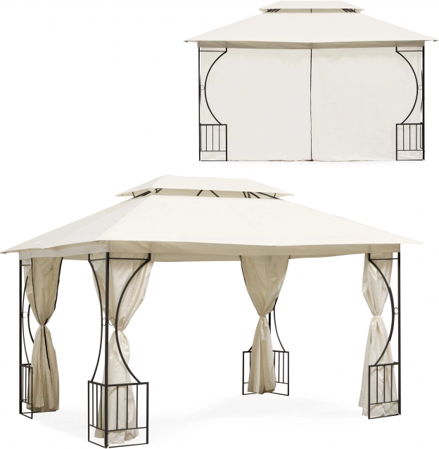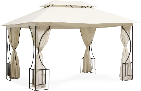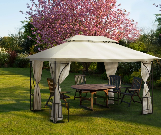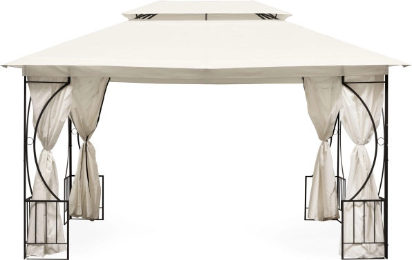 Slogoven vrtni paviljon 3 × 4 m v elegantni bež barvi znamke MULTIGARDEN nudi prostorno senco ter zaščito pred vetrom in dežjem. Ima stabilno jekleno konstrukcijo z možnostjo pritrditev v tla, dvojno streho za boljše prezračevanje in bočnice na zadrgo za hitro zapiranje. Trpežno blago je odporno na dež in sonce, zato je idealno za vrt, teraso in zunanje druženje.