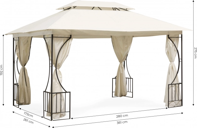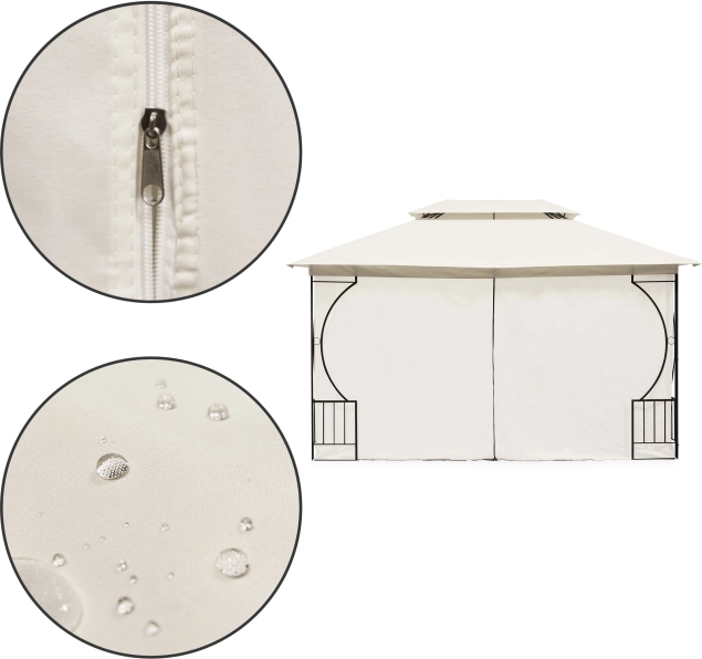 Uživajte v udobnem sedenju na prostem ne glede na vreme. Ta vrtni paviljon združuje eleganten dizajn in trpežne materiale – praškasto lakiran jekleni okvir zagotavlja dolgo življenjsko dobo, streha z dvojno ventilacijo pa prijetno kroženje zraka. Bočnice z zadrgo omogočajo hitro zapiranje prostora za več zasebnosti in zaščite.