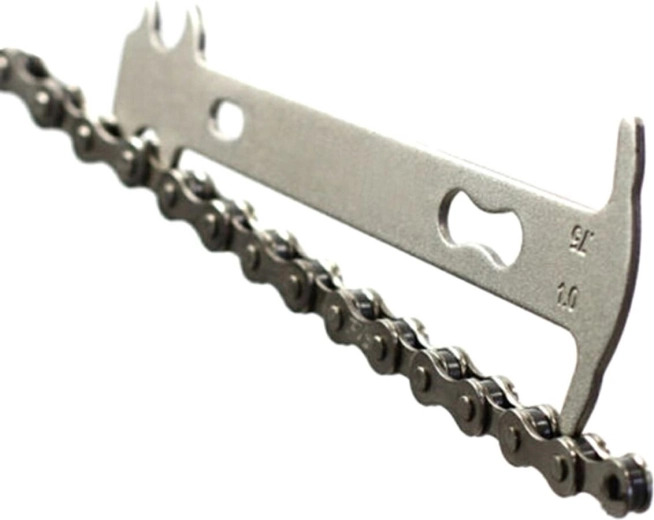 Kompaktno orodje za preverjanje stanja verige kolesa. Zelo enostavno za uporabo – preprosto vstavite zaobljen konec merila v člen verige, drugi konec orodja pa naslonite na napeto verigo. Merilo prikazuje stopnjo obrabe na lestvici 75 % in 100 %. Če se konec merila ne prilega med člene, to pomeni, da je veriga v odličnem stanju.