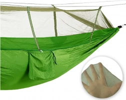 Močne karabine, trpežne vrvi za pritrditev na drevesa in za napenjanje mreže proti komarjem so priložene. Obešanje opravite v trenutku kjer koli v naravi.
