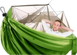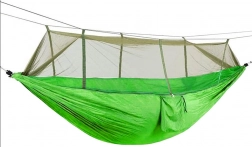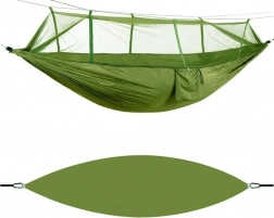 V paketu je vse potrebno za hitro namestitev – močne karabine, trpežne vrvi za pritrditev na drevesa in za napenjanje mreže proti komarjem. Integriran žep služi za malenkosti in hkrati kot ovojnica za enostavno pospravljanje. Z nosilnostjo do 150 kg in merami 250 × 140 cm nudi udobje za eno do dve osebi.