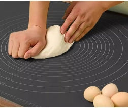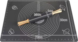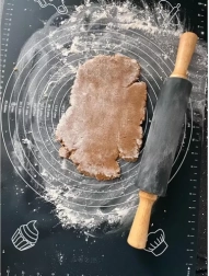 Komplet RUHHY združuje kakovostno silikonsko podlogo z natančnimi krožnimi in linearnimi merilnimi lestvicami ter valjar s silikonsko površino in lesenimi ročaji. Podloga trdno oprime kuhinjskega pulta, ne drsi in zahvaljujoč protisprijemni površini se testo ne lepi – brez nepotrebnega posipanja z moko. Radodarna velikost 70 × 50 cm nudi dovolj prostora za pico, piškote, medenjake in vzhajana testa.