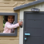 Po pritisku na gumb se oglasi jasen »ding-dong«, ki podpira interaktivno igro in pozdravlja goste pri otroški hišici.