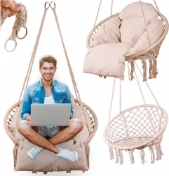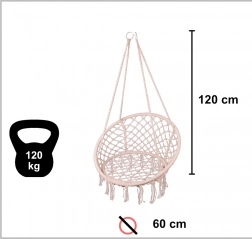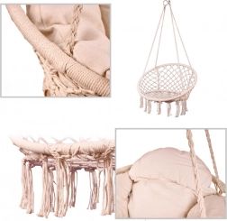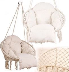 Ta viseči gugalni stol nudi udobno sedenje za trenutke počitka in nežnega guganja. Velika okrogla oblika in mehka blazina podpirata ergonomičen položaj telesa, medtem ko trdne bombažne vrvi in kovinski okvir zagotavljajo zanesljivost in dolgo življenjsko dobo.