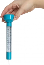 Termometer je izdelan iz odporne plastike in ima pregledno lestvico v Celziju in Fahrenheitih. S priloženo vrvico ga preprosto pritrdite na lestev, stopnice ali rob bazena, da ne odplava.