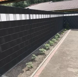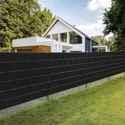 Neprosojen črn trak ustvari eleganten zaslon, izboljša akustično udobje in ščiti pred vetrom. Idealen za panelne ograje in balkone.