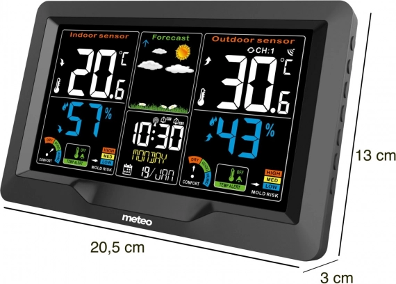 Meteo domača meteorološka postaja je visoko opremljena naprava za spremljanje vremena. Ponuja brezžično merjenje temperature in vlažnosti. Napoveduje vremensko stanje z ikonami in nudi udobni indikator udobnosti.