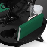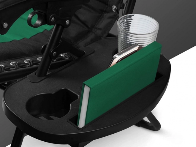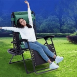 Ležalnik vključuje nastavljiv vzglavnik, ergonomske ročaje in praktično stransko mizico za pijačo in drobnarije.
