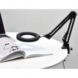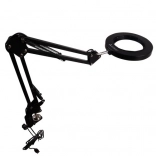 Svetilka z lupo IZOXIS združuje moderen dizajn, prilagodljive roke in kakovostno optiko za natančno delo z detajli. Krožni LED obroč enakomerno osvetli območje okoli leče ter poveča kontrast in berljivost detajlov brez utrujenosti oči. Kovinski vijačni primež z vijakom drži svetilko trdno na mizni plošči do debeline 5 cm.