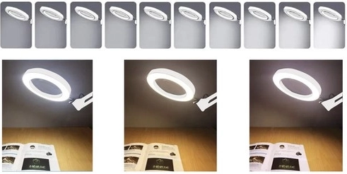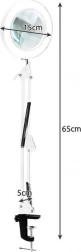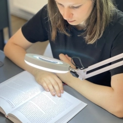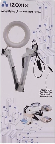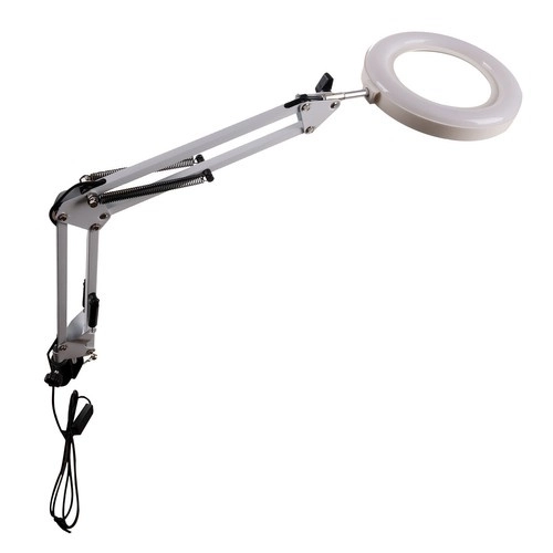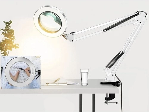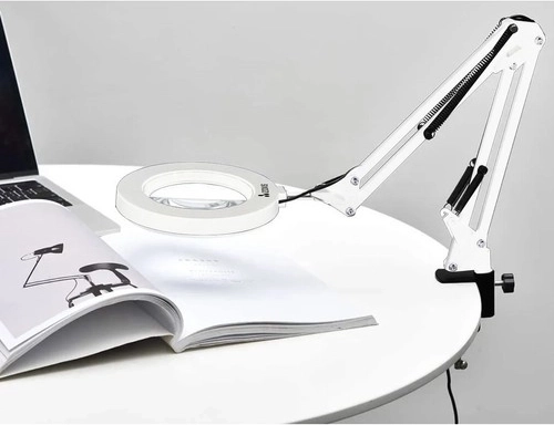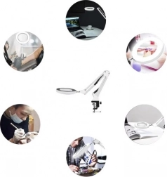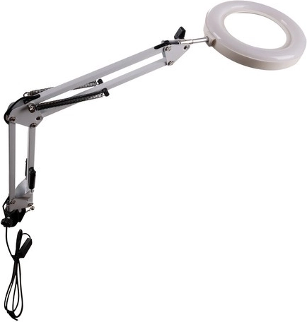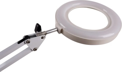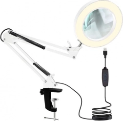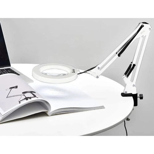 Praktična namizna svetilka z lupo in krožno LED osvetlitvijo za natančno delo v kozmetiki, manikiri, obrtništvu in elektroniki. Ponuja 3 barve svetlobe (topla, nevtralna, hladna), 10 stopenj svetlosti, stabilno kovinsko roko z vzmetmi in vpenjalni nosilec za namizno ploščo. Steklena leča 3× poveča brez popačenj in zagotavlja oster prikaz. Napajanje prek USB z upravljalnikom na kablu.