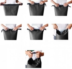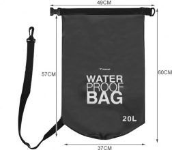 Vreča je izdelana iz vzdržljivega PVC z dodatkom poliestra in PP, kar zagotavlja trdnost, odpornost proti obrabi ter enostavno čiščenje. Zahvaljujoč nastavljivemu ramenskemu traku (55–105 cm) je nošenje udobno, vrečo pa lahko pritrdite tudi na večjo prtljago ali čoln.