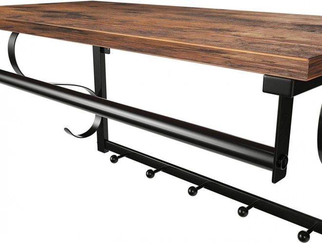 Ta univerzalna stenska polica z obešalnikom ohranja red in prihrani prostor. Zgornja stabilna polica je idealna za rože, knjige, škatle ali dekoracije, medtem ko 5 kljuk in drog zanesljivo nosijo plašče, jakne, torbe in ključe. Robustni kovinski okvir in odporna polica v rustikalno rjavi barvi se odlično podata v moderne in industrijske notranjosti.