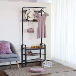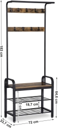 Ta univerzalni obešalnik za predsobo pomaga ukrotiti plašče, jakne in dodatke, hkrati pa nudi udoben prostor za obuvanje. Zahvaljujoč robustnemu kovinskemu okvirju in lesenim policam v rustikalnem dekorju dobite trpežen in stilski kos pohištva, ki se odlično poda tako v moderne kot industrijske interierje.