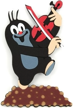 Kreativna zasnova Krtek z rdečo violino, stoječe na rjavem hribčku.