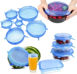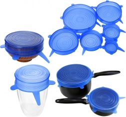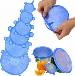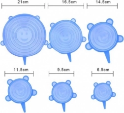 Šest pokrovčkov različnih premerov pokrije kozarce, sklede, lonce in tudi prerezano sadje – od malih lončkov do velikih skled.