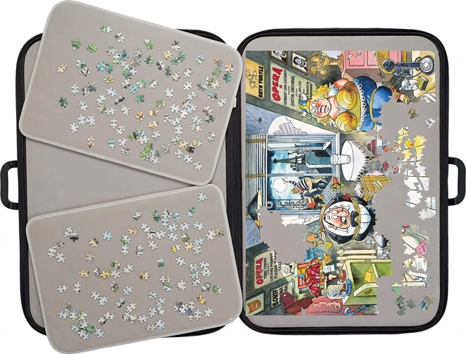 Praktična prenosna mapa za sestavljanke za 500–1000 koščkov znamke JUMBO vam omogoča sestavljanje, varno shranjevanje in nadaljevanje kadarkoli. Zahvaljujoč nedrseči površini, zapiranju na zadrgo in udobnemu ročaju boste razdelano sestavljanko ohranili na varnem in jo zlahka prenesli. V paketu najdete tudi dve samostojni podlagi za razvrščanje koščkov.