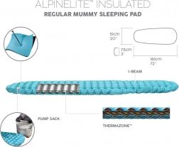 AlpineLite Insulated Regular Mummy podloga je idealna izbira za vse, ki želijo udobje med sproščanjem na plaži, med kampiranjem ali prenočevanjem na prostem v šotoru. Napihovanje je enostavno in hitro zahvaljujoč inovativnemu sistemu AirCinch™, kjer je dovolj pritisniti z dlanmi na vrečo in podloga se hitro napolni z zrakom. Ta set je popoln, zato vam ni treba skrbeti, da bi pozabili na tlačilko.