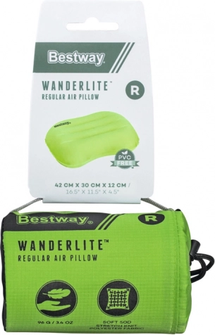 Napihljiva blazina Bestway WanderLite je izdelana iz vzdržljivega materiala ToughLite in mehkega, elastičnega poliestrskega pletiva 50D. Je lahka in ne zavzame veliko prostora, enostavno se zloži in prenaša. Zaradi ovitka, v katerega jo po vsaki uporabi lahko shranite, je shranjevanje enostavnejše.