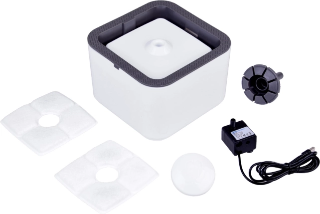 V paketu je vse potrebno za takojšnjo uporabo: rezervoar, pokrov z nosilcem filtra, šoba, žleb, pokrovček, 2× filter in tiha USB črpalka. Idealna rešitev za zdravo hidracijo psov in mačk.