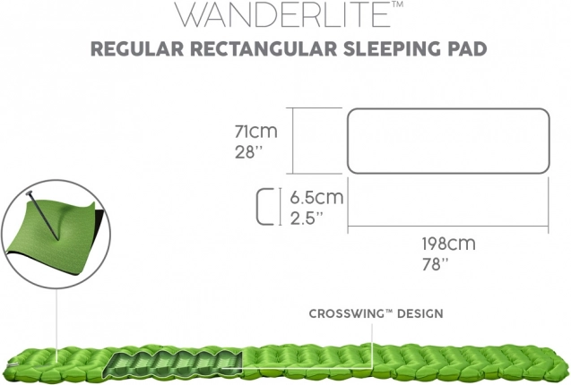 Premišljena konstrukcija CrossWing z nagnjenimi zračnimi komorami drži telo stabilno na sredini in pomaga preprečevati drsenje. Nizkoprofilni ventil poskrbi za hitro napihovanje in izpihovanje ter omogoča preprosto regulacijo tlaka za idealno trdoto po vaših željah.