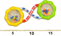 Ropotuljica v obliki uteži je idealna prva igrača za dojenčke. Prozorni konci z raznobarvnimi kroglicami ustvarjajo zanimive vizualne učinke in prijetno rožljanje, ki otroka motivira k prijemanju in raziskovanju. Zaradi kompaktne velikosti se udobno prilega vsaki otroški ročici.