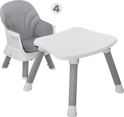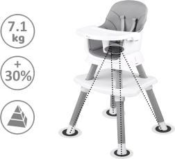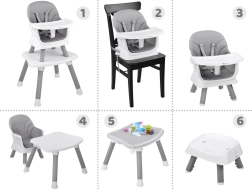 En stolček pokrije hranjenje, obedovanje in igro: visok in nizek stolček, nastavek na stol, stolček z mizico, igralna plošča za kocke in praktičen tabure.