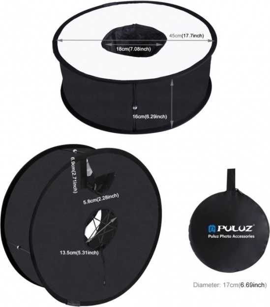 Fotografski difuzor Puluz omogoča popolno razpršitev svetlobe za zajem profesionalnih fotografij. Enakomerno porazdeli svetlobo na fotografirani objekt, s čimer preprečuje preosvetlitev in ostre sence. Zaradi elastičnega traku je namestitev zelo enostavna in hitra. V zloženem stanju je zelo kompakten, kar omogoča enostavno prenašanje in ustvarjanje mini studia kjerkoli.