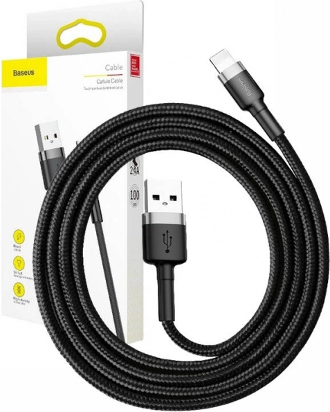 Vzdržljiv sivo‑črn kabel Baseus Cafule s priključki USB–Lightning ponuja hitro polnjenje 2,4 A in prenos podatkov 480 Mb/s. Zahvaljujoč tekstilnemu opletu, aluminijastim konektorjem in ojačanemu upogibnemu vratku je izjemno trpežen, se ne zapleta in zanesljivo poveže naprave APPLE z Lightning priključkom s polnilniki ali računalniki.