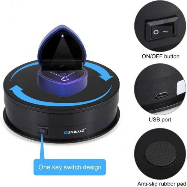 Panoramsko vrtljivo stojalo Puluz je odlična rešitev za elegantno razstavljanje različnih predmetov, kot so nakit, ure ali majhne torbice. To stojalo ponuja enostavno upravljanje z enim gumbom, kar olajša vklop, izklop ali spremembo smeri vrtenja.