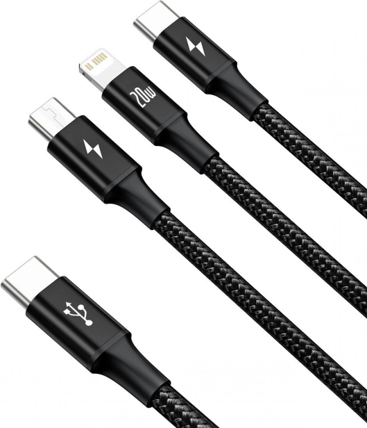 Ta praktični kabel blagovne znamke Baseus omogoča napajanje do 3 naprav hkrati. Združljiv z široko paleto naprav zahvaljujoč priključkom Lightning, USB-C in Micro USB, omogoča hitro polnjenje do 20W. Hitrost prenosa podatkov doseže do 480 MB/s, kar ga naredi idealno rešitev za sodoben življenjski slog.