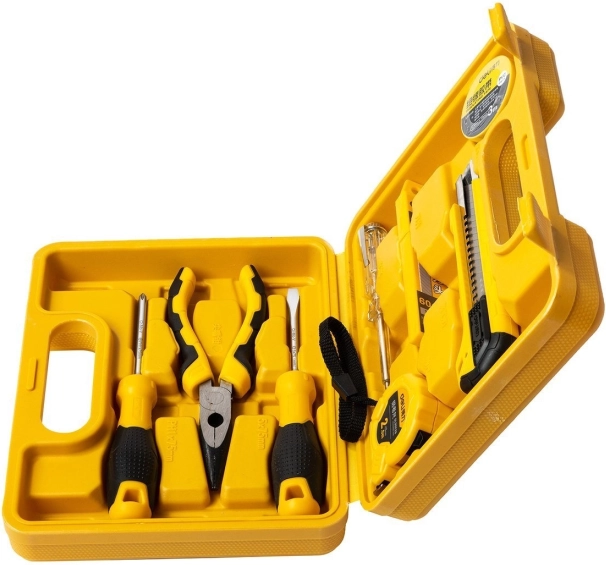 Komplet vključuje: nož z nastavljivo dolžino rezila, 10 rezervnih rezil, 3m obstojen izolacijski trak in 2m merilni trak. Prav tako vsebuje 2 izvijača z nedrsečim ročajem, klešče iz nerjavečega jekla ter preizkuševalec napetosti odporen proti koroziji za območje 100-500 V.