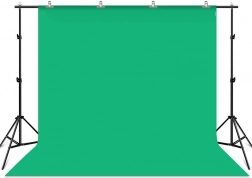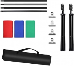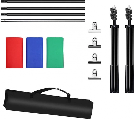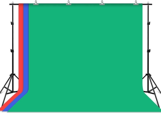 V kompletu so tri platnena ozadja - zelena, modra in rdeča, vsaka z dimenzijami 3 x 2,9 m, tako da si vsak izbere glede na potrebo. Komplet je idealen za snemanje vlogov, žive prenose ali fotografiranje različnih dogodkov.