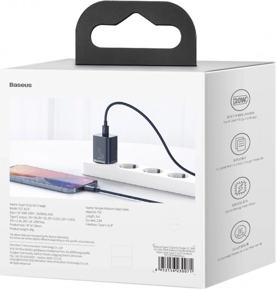 Baseus Super Si hitri polnilec 20 W z USB‑C + kabel USB‑C – Lightning 1 m (modra)