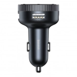 Vgrajen LED-zaslon prikazuje frekvenco ali napetost električnega sistema vozila, velik protidrsni gumb omogoča hitro spremembo FM-frekvence ali glasnosti. Dva priključka USB lahko hkrati polnita telefon in druge naprave s skupno močjo do 17 W. Zaradi številnih varnostnih zaščit (prenapetost, previsok tok, pregrevanje, kratek stik, preobremenitev) je uporaba v vozilu povsem brezskrbna.