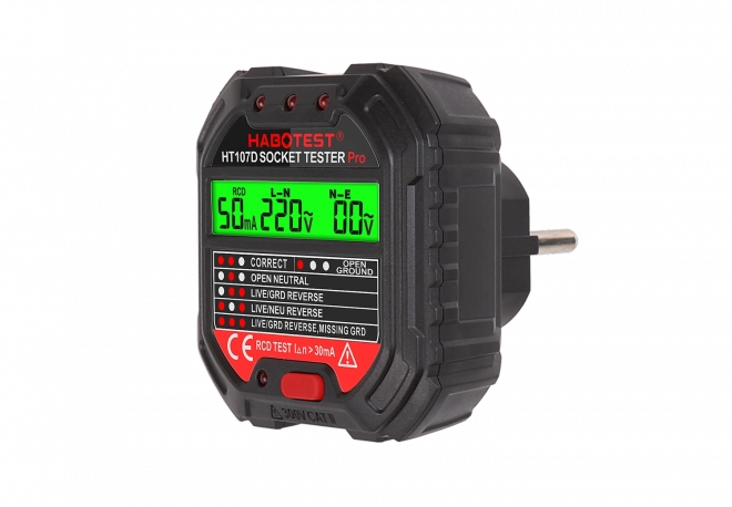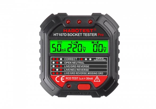Poskrbite za varnost in pregled nad stanjem električnih vtičnic. Tester HABOTEST HT107D ponuja pregleden LCD-zaslon z osvetlitvijo, ki prikazuje trenutno napetost in rezultat testa ožičenja. LED-indikatorji na zgornji strani jasno signalizirajo pravilno ožičenje, manjkajoč zaščitni vodnik, prekinjen nevtralni vodnik ali druge napake. Z enim samim pritiskom gumba izvedete tudi funkcijski test RCD.