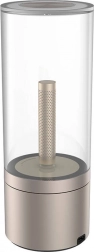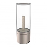 Upravljanje je intuitivno: z vrtenjem zgornjega dela uravnavate svetilnost, s stikalom na osnovi izberete način plamena ali stalno svetlobo. Vgrajena baterija 2500 mAh zdrži do 100 ur pri najnižji svetilnosti (pribl. 9,5 h pri najvišji); polnjenje poteka prek USB‑C. Minimalistična izvedba s steklenim ohišjem in kovinskimi poudarki se poda v vsak interier.