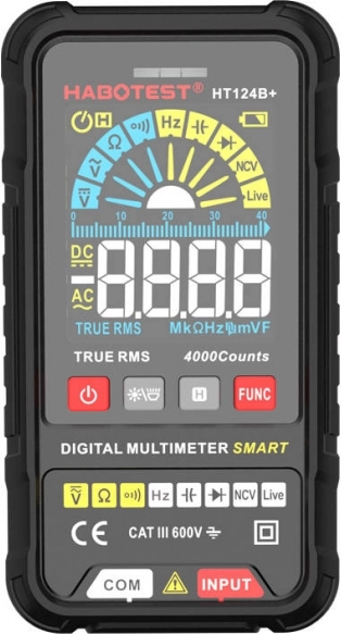 HABOTEST HT124B+ združuje širok nabor funkcij in varnostne standarde EN61010-1, CAT III 600 V. Zaradi kompaktnosti 130 × 70 × 23 mm in mase 125 g odlično leži v roki in se zlahka prilega torbi. Mehko, na udarce odporno ohišje povečuje vzdržljivost in izolacijo, medtem ko velik zaslon z osvetlitvijo ozadja zagotavlja odlično berljivost vrednosti.