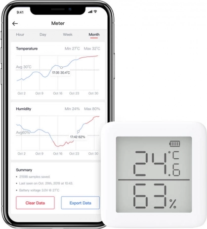 Povežite napravo prek Bluetootha z aplikacijo SwitchBot, spremljajte zgodovino do 5 tednov (ali neomejeno v oblaku s hubom), izvažajte podatke v CSV in prejemajte pametna opozorila.