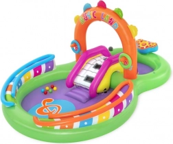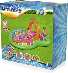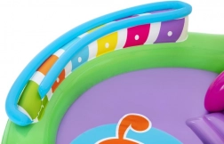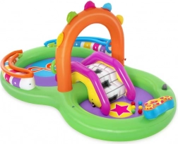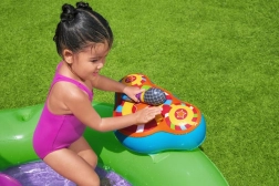 Raziščite in uživajte v številnih zabavnih funkcijah z napihljivim vodnim igralnim centrom Sing and Splash. Igralno središče vključuje mikrofon in boben, s katerima se lahko otroci igrajo in prebudijo svojo domišljijo. Dvojna bazenčka sta povezana z odstranljivim toboganom, pritrjenim z vrvmi in zankami. V tla je vgrajena napihljiva blazina za mehak pristanek s tobogana. Lok z vgrajenim razpršilnikom je treba le priključiti na vrtno cev. Na konice na loku lahko mečete napihljive obročke. Del kompleta je 6 barvnih žogic, ki jih lahko spuščate po eni ali drugi rampi. Te igre niso le zabavne, temveč razvijajo tudi koordinacijo roka-oko.