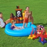 Spremenite vrt v pravo malo vodno kraljestvo. To napihljivo piratsko igrišče BESTWAY ponuja moder bazenček z ladijsko dekoracijo, z vrtljivim krmilom, metanjem obročev/zvezdic in veselo hobotnico. Izdelano je iz odpornega PVC, enostavno za postavitev in idealno za varno vodno zabavo najmlajših.